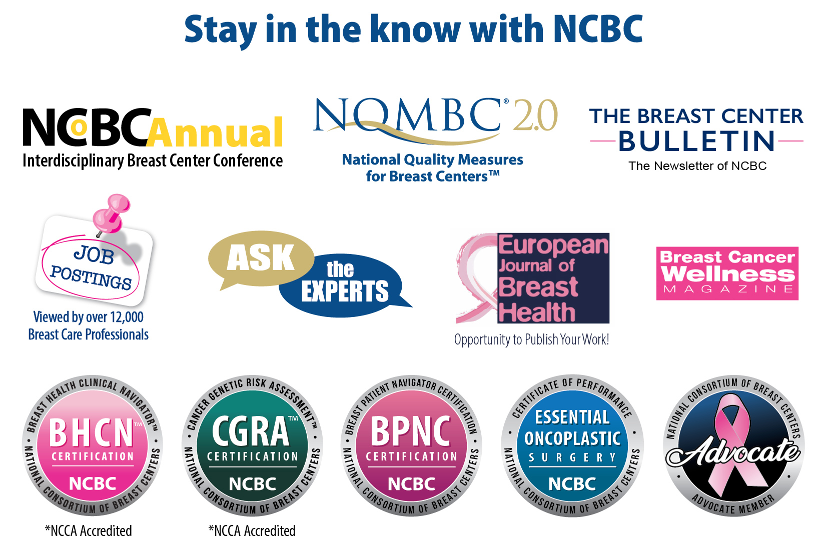 We accomplish this goal through our annual conference, email question program, Navigator certification, Cancer Genetics and Risk Assessment Certification, Certified Breast Assessment, our NQMBC™ Program and many networking opportunities. If that is not enough, NCBC also partners with the most advanced breast health suppliers to give you the most up to date information.